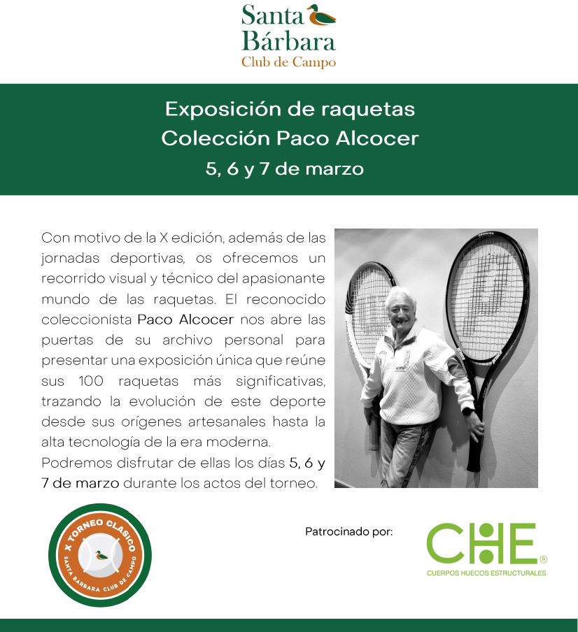 Con motivo de la X edición, además de las jornadas deportivas, os ofrecemos un recorrido visual y técnico del apasionante mundo de las raquetas. El reconocido coleccionista Paco Alcocer nos abre las puertas de su archivo personal para presentar una exposición única que reúne sus 100 raquetas más significativas, trazando la evolución de este deporte desde sus orígenes artesanales hasta la alta tecnología de la era moderna.